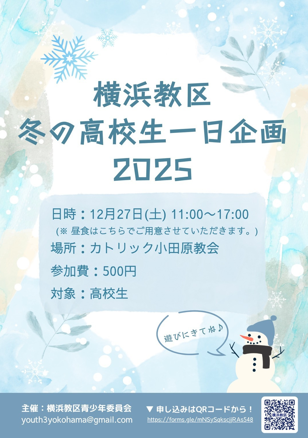 横浜教区青少年委員会は下記の通り冬の高校生一日企画を開催します。