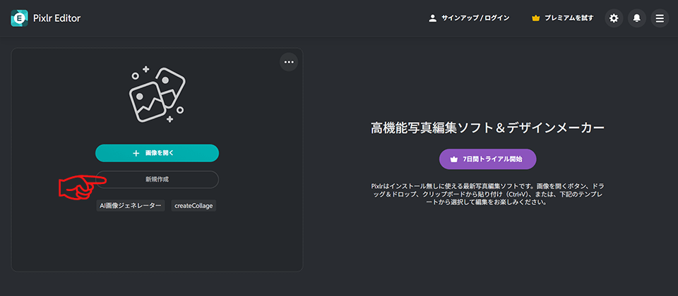 1. Pixlr Editor 「新規作成」をクリック
