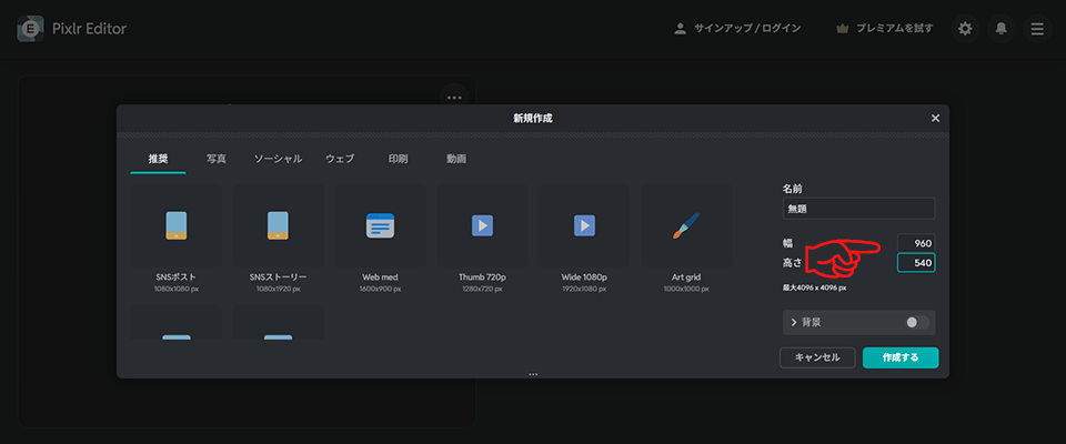 2. 「幅 960」「高さ 540」に設定「作成する」をクリック