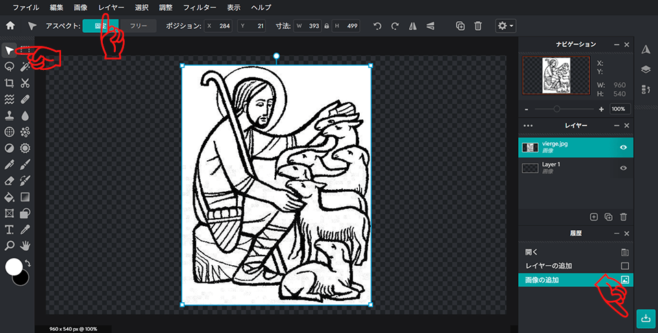 矢印のアイコン「アレンジ」をクリック、次いで今開いた画像を選択。引き伸ばしたり縮めたりしながら画用紙の上にレイアウトします。